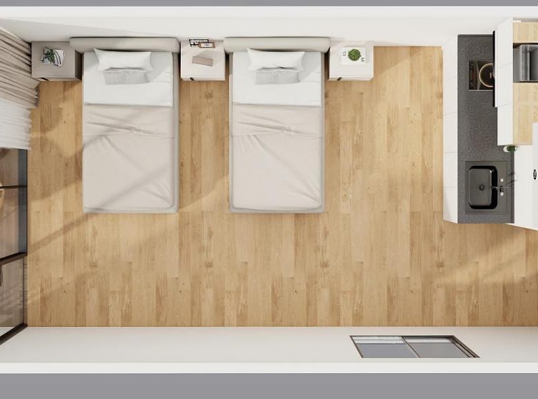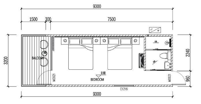 Es una versión extendida del modelo M1, aumentando el largo de la casa se consigue suficiente espacio interior para 2 camas.